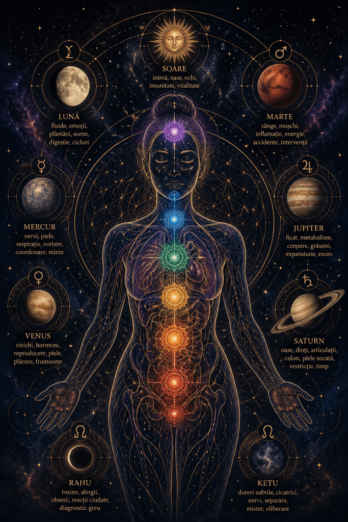 În tradiția Jyotish-ului vedic, universul nu este un decor inert pe fundalul vieții omenești, ci o prezență vie, pulsatilă, care se reflectă neîncetat în structura fiziologică și psihologică a fiecărei ființe. Cele nouă planete — Navagrahas — nu sunt simple corpuri cerești care orbitează în tăcere; ele emit frecvențe specifice, fiecare guvernând organe, țesuturi și funcții ale corpului uman. Atunci când o planetă este „afectată” — plasată într-un semn neprielnic, aflată sub influența unor aspecte dure sau slăbită prin conjuncturi dificile — această perturbare vibratorie se traduce, în cele din urmă, în suferință fizică sau dezechilibru mental.